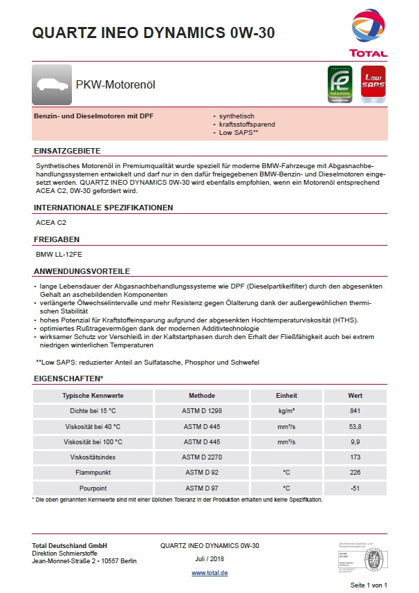 Total Quartz INEO Dynamics 0W-30 entspricht der BMW-Werksnorm LL-12 FE und vervollständigt das Angebot von Total-Motorenölen für BMW. Total ist momentan der einzige Motorenölhersteller auf dem Markt, der zu jeder BMW-Werksnorm ein freigegebenes Motorenöl hat.